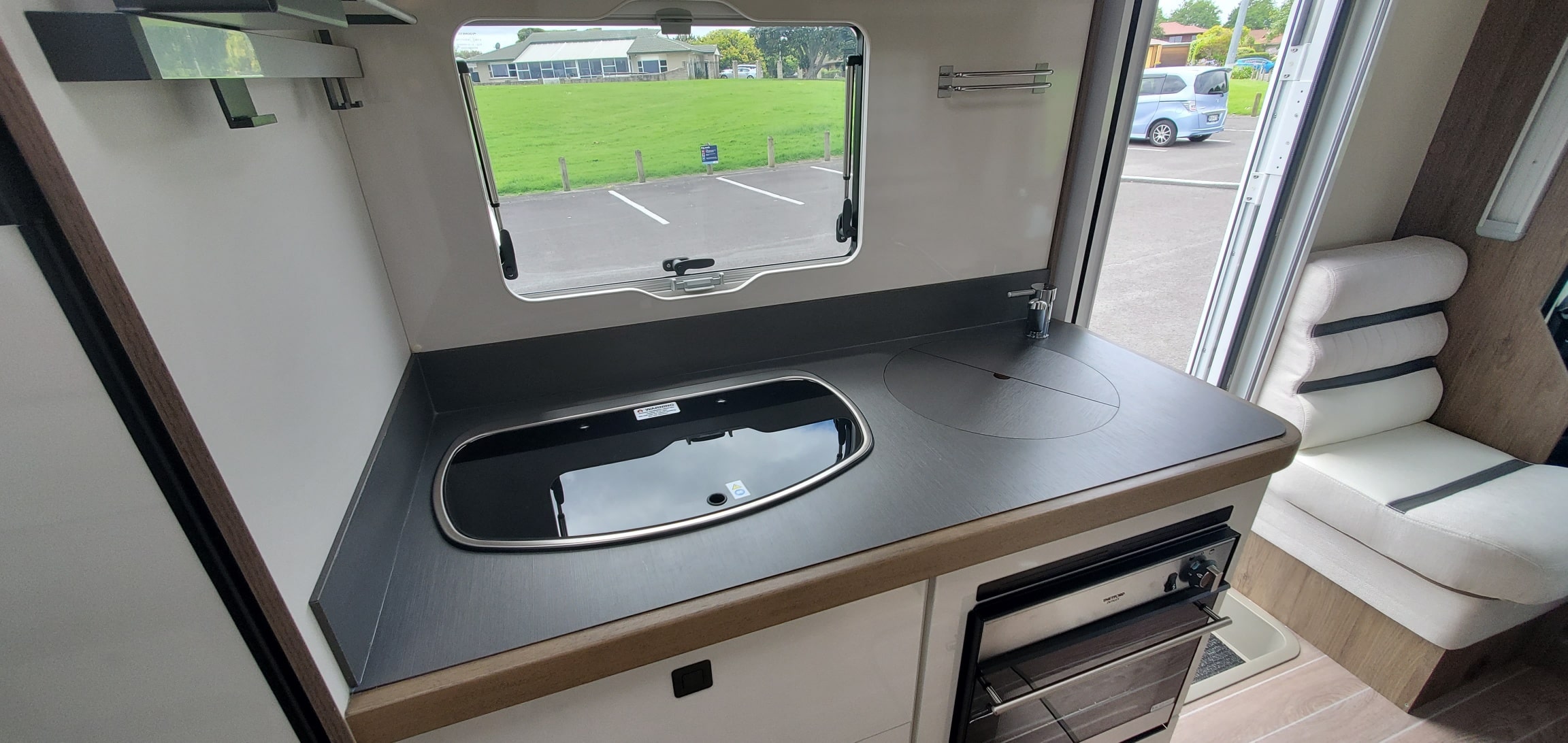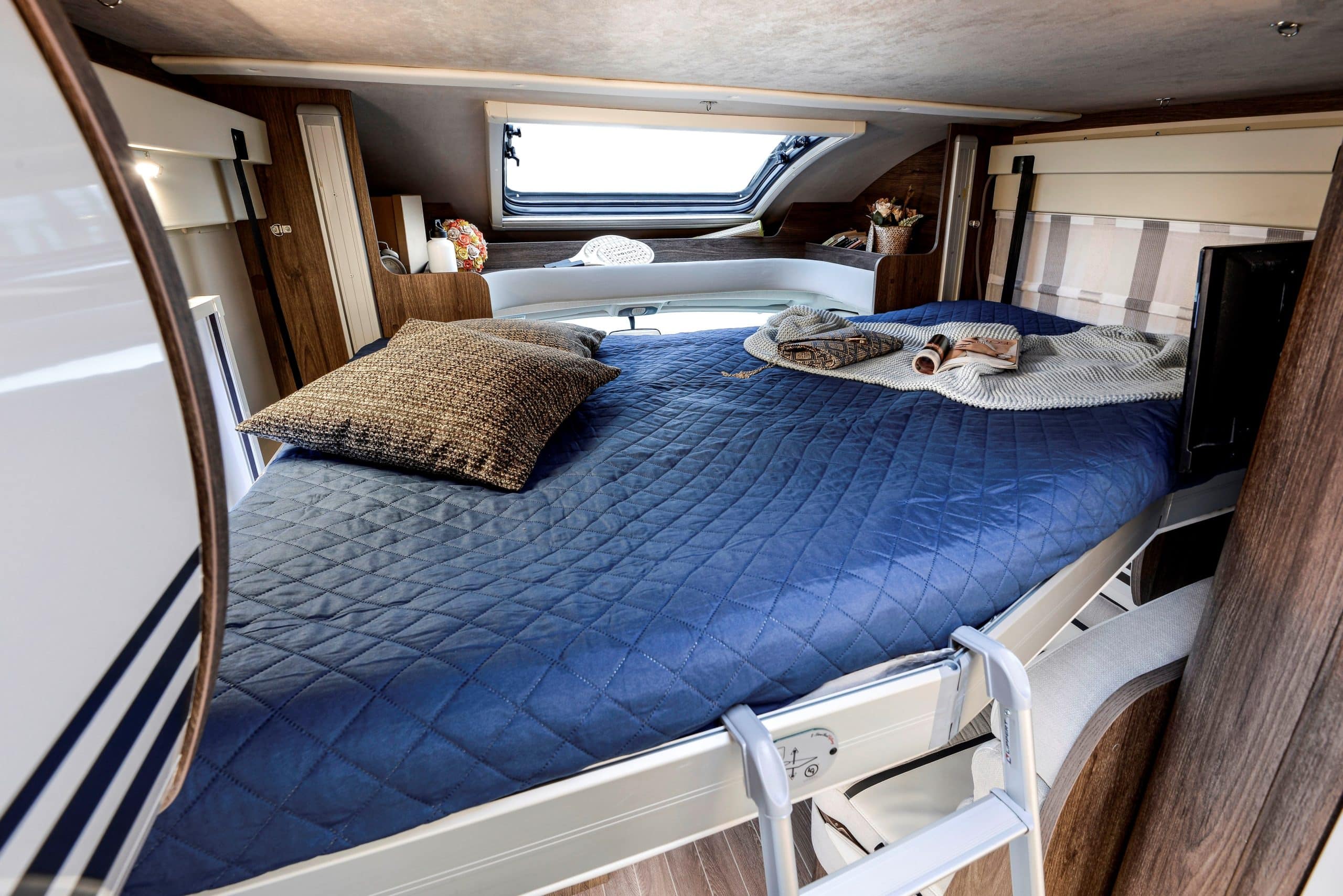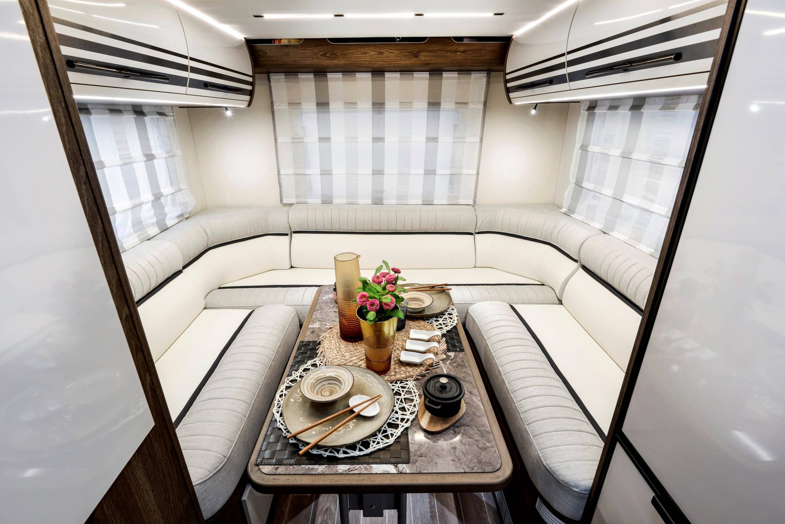Bentley comes with the very popular dual lounge layout, a U shaped rear lounge with 360 degree panoramic viewing windows and with a convenient drop down large double bed (1900mm x 1280mm) that lowers from the ceiling and stows away neatly in the ceiling during the day, and all of this in a very compact form at only 7m intotal length.