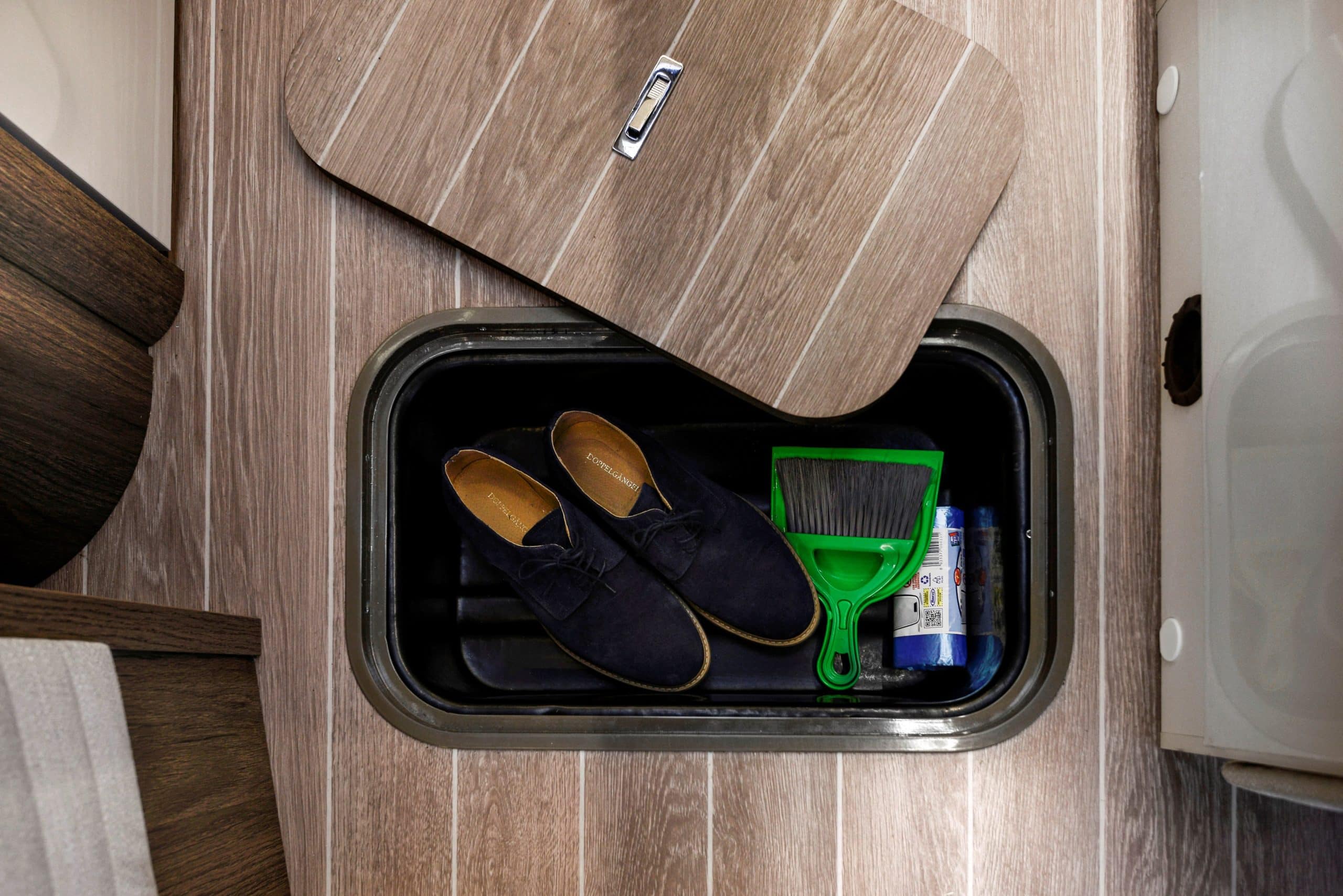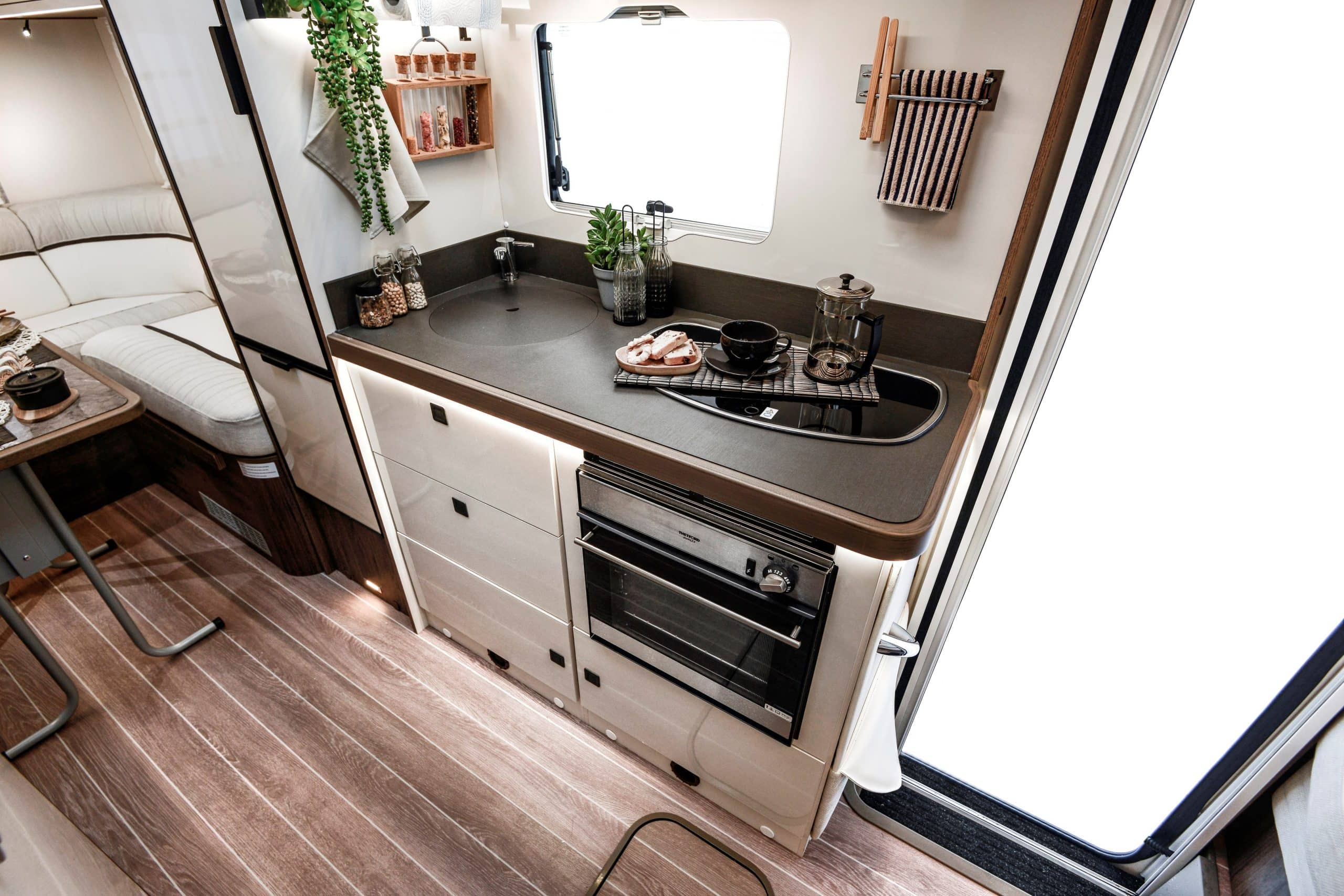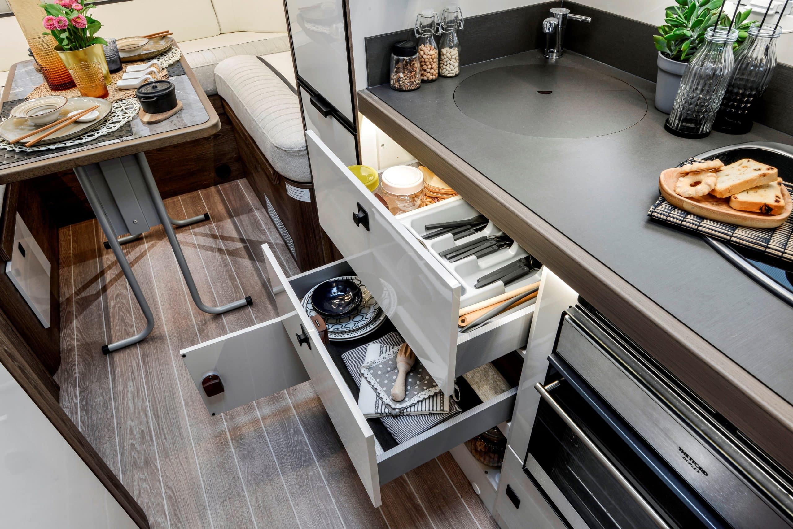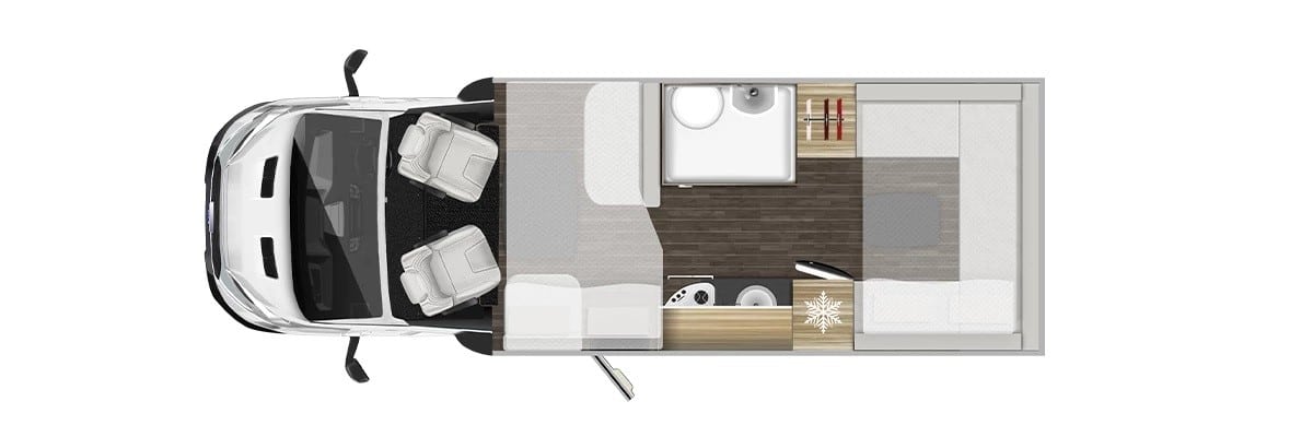 Bentley comes with the very popular dual lounge layout, a U shaped rear lounge with 360 degree panoramic viewing windows and with a convenient drop down large double bed (1900mm x 1280mm) that lowers from the ceiling and stows away neatly in the ceiling during the day, and all of this in a very compact form at only 7m intotal length.