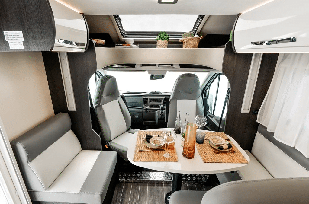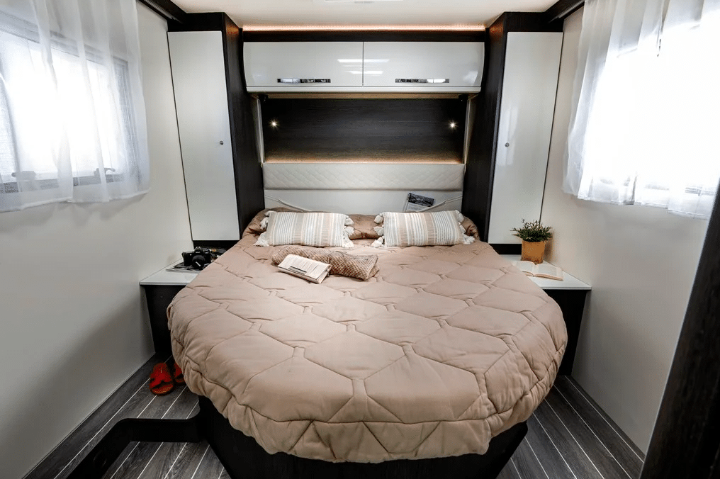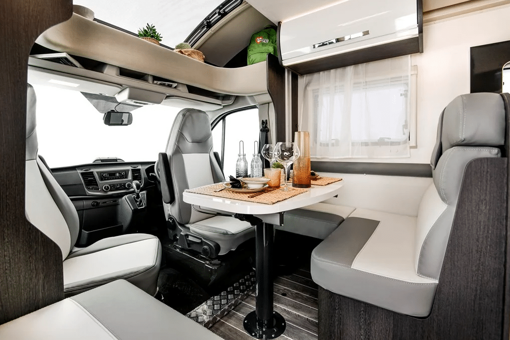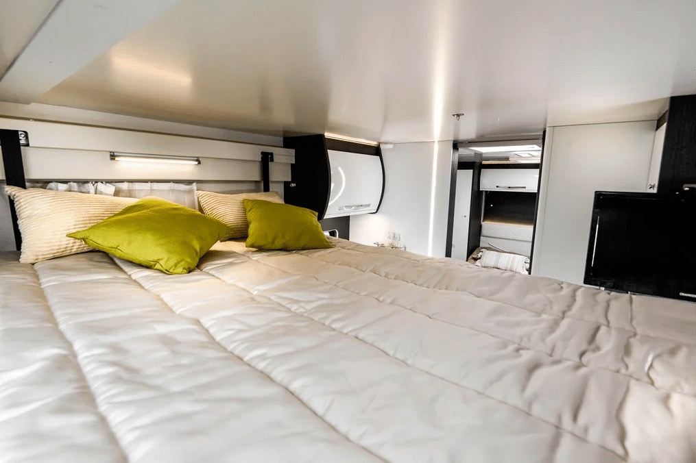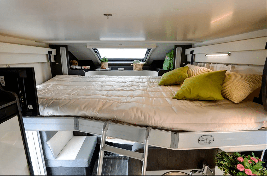 Seat belted for 4 people (4 berth) there is a 2nd double bed (1900 x 1280) that lowers from above the front dinette and stows away neatly in the ceiling during the day.